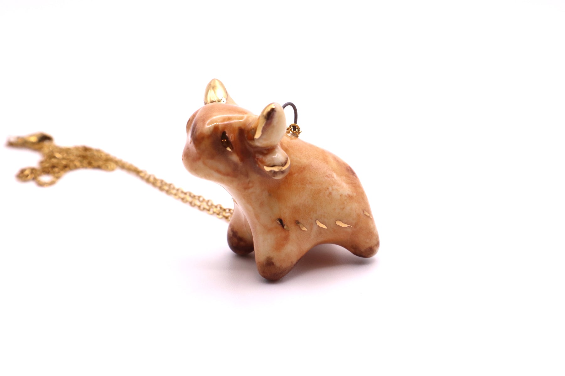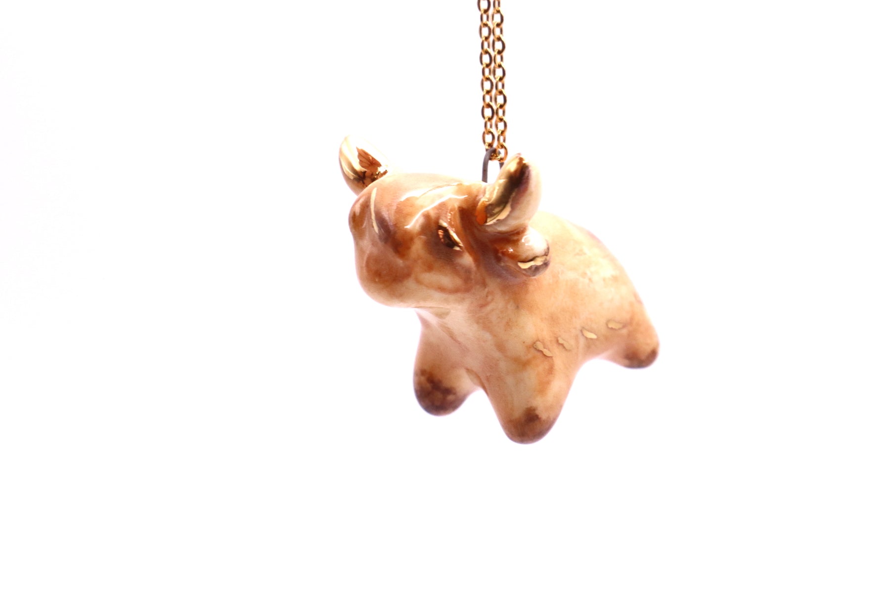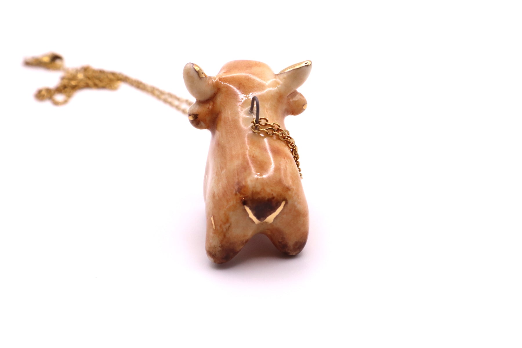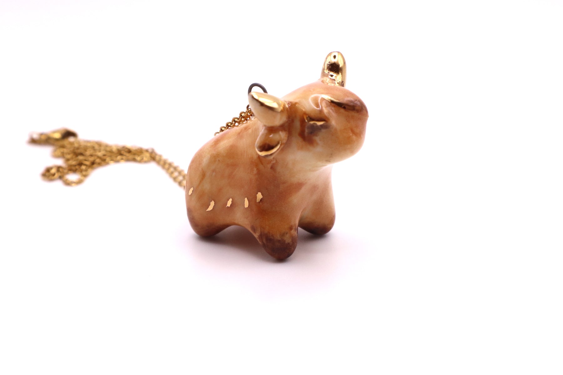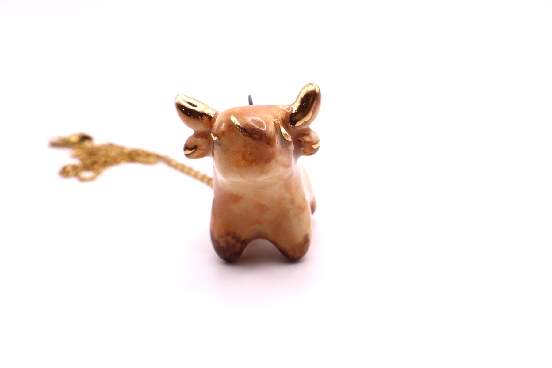 This long necklace features lovingly handmade porcelain animal. It has been hand sculpted and finished with a beautiful non-toxic glaze and gold luster. The luster contains real gold with a brilliance of 22K.