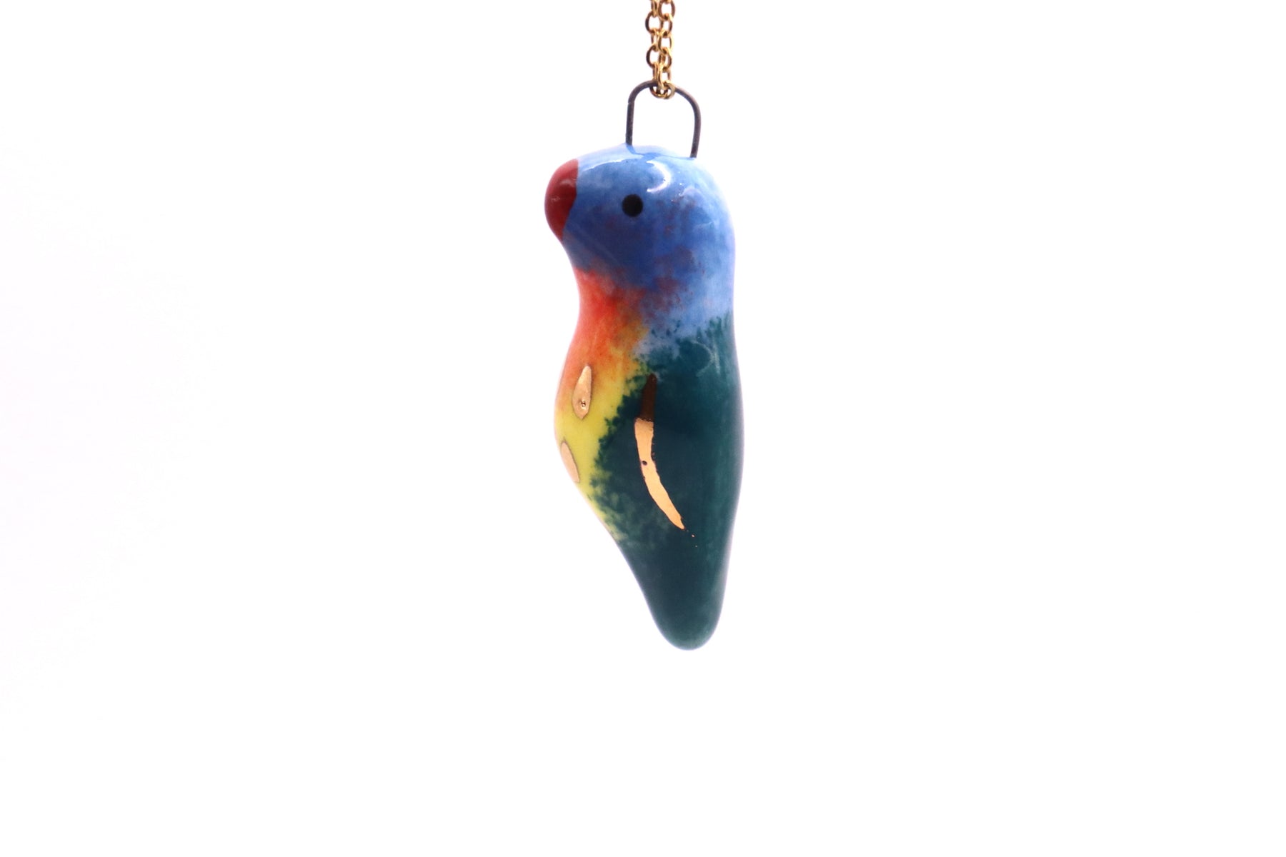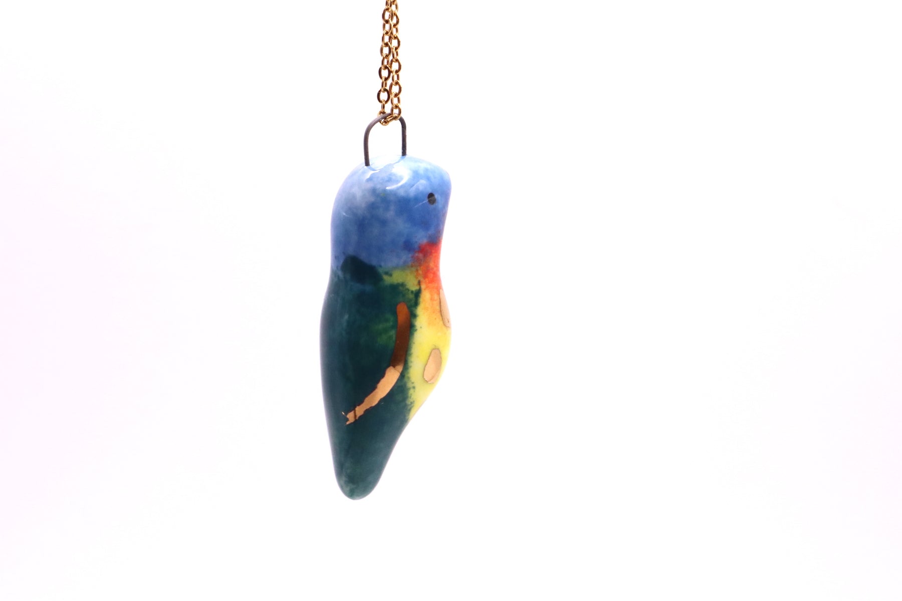 This long necklace features lovingly handmade porcelain animal. It has been hand sculpted and finished with a beautiful non-toxic glaze and gold luster. The luster contains real gold with a brilliance of 22K.