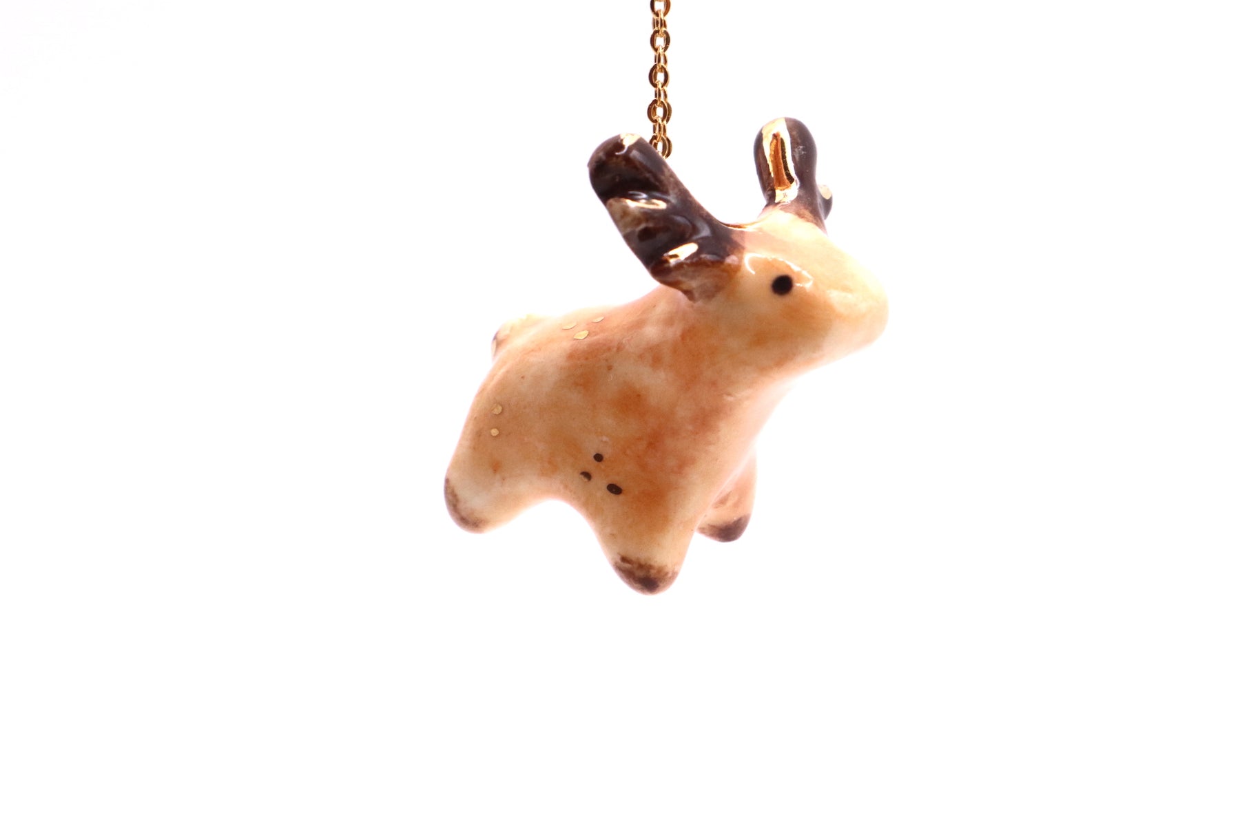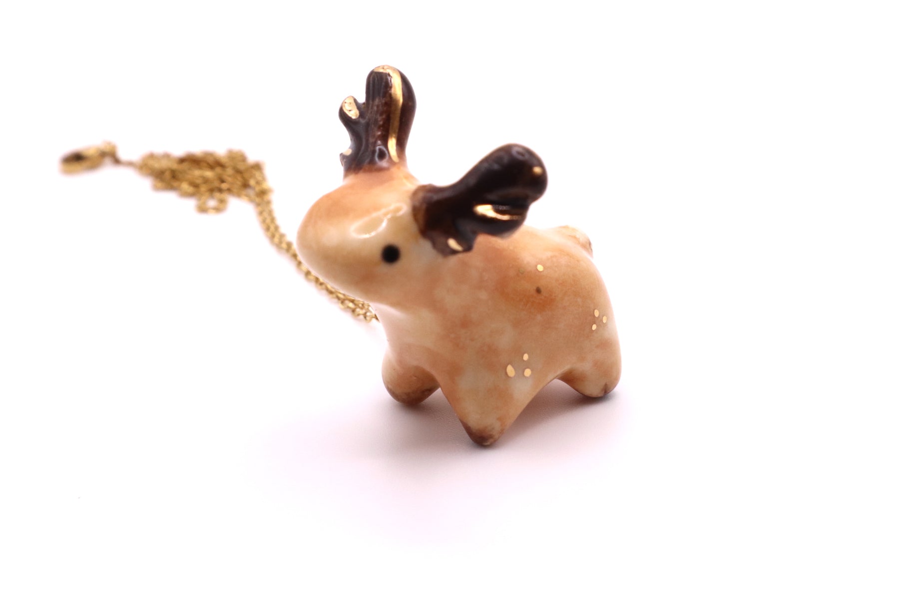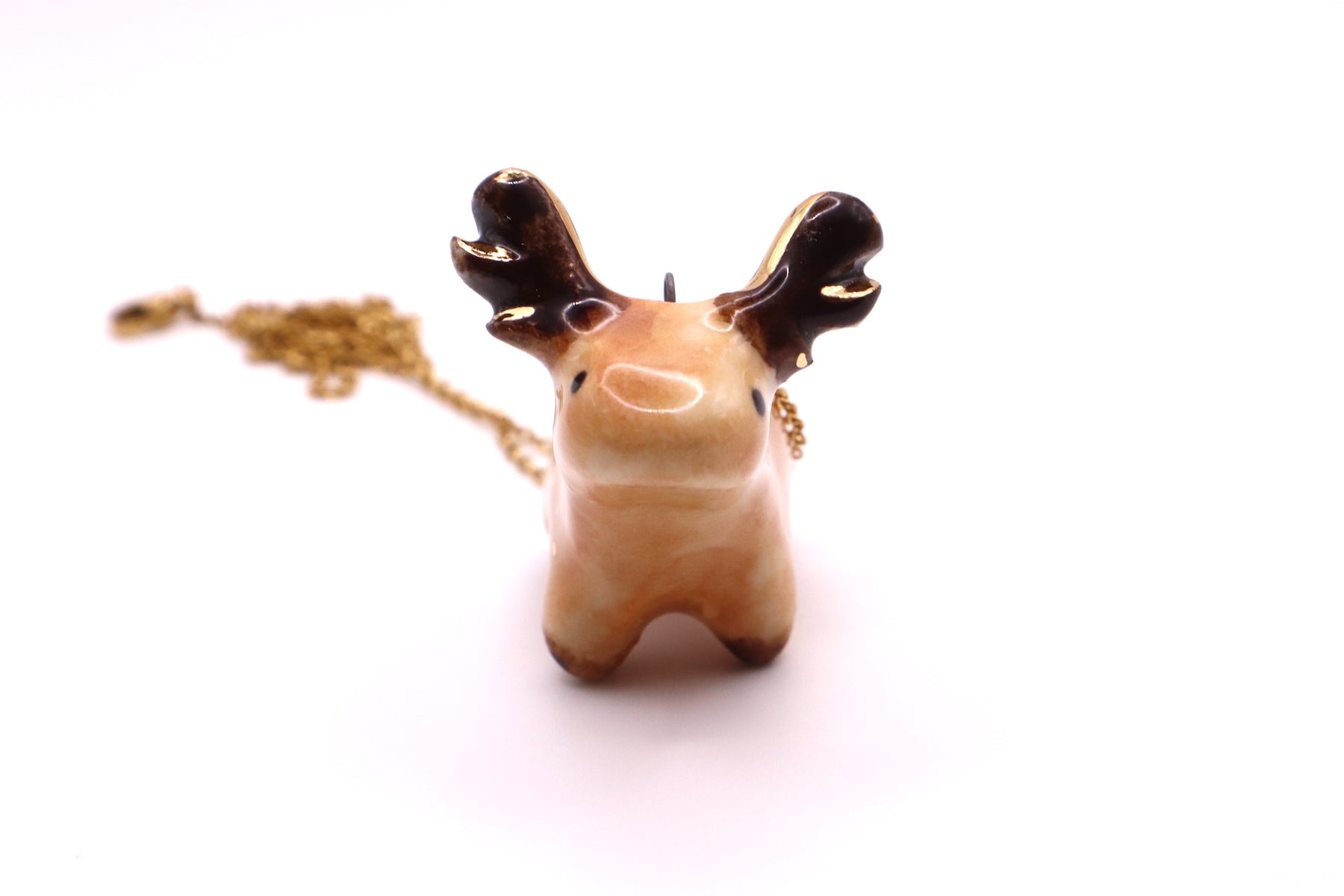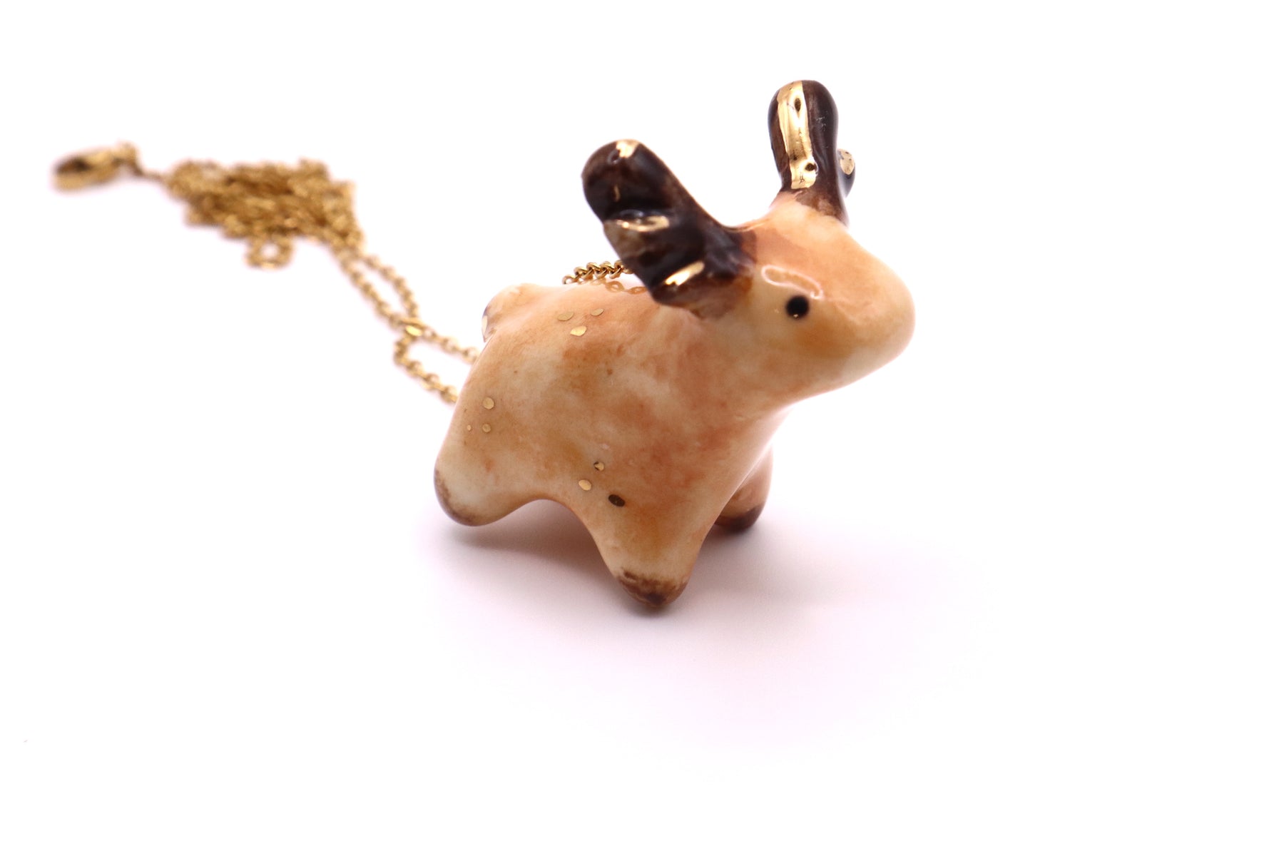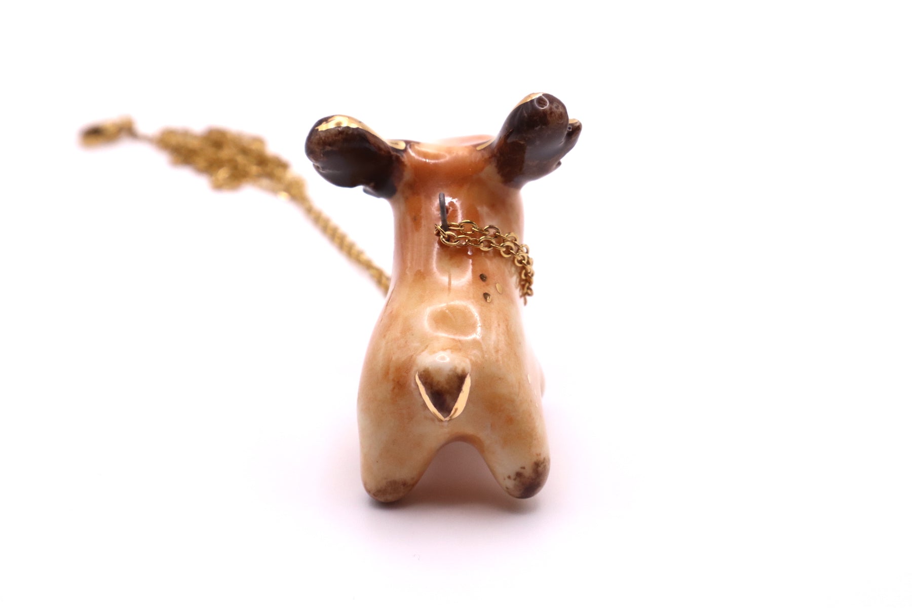 This long necklace features lovingly handmade porcelain animal. It has been hand sculpted and finished with a beautiful non-toxic glaze and gold luster. The luster contains real gold with a brilliance of 22K.