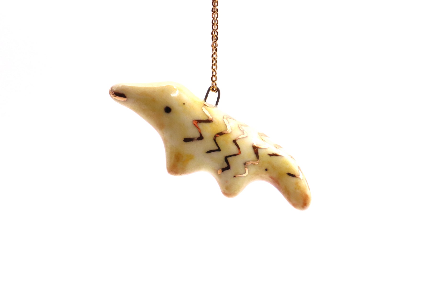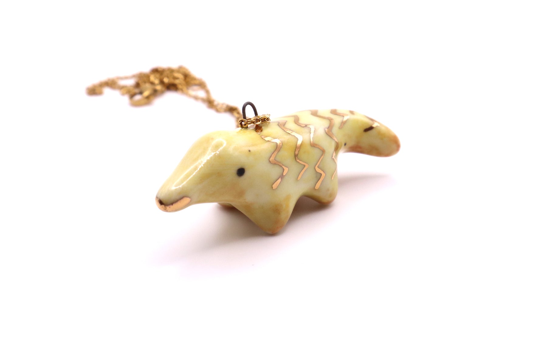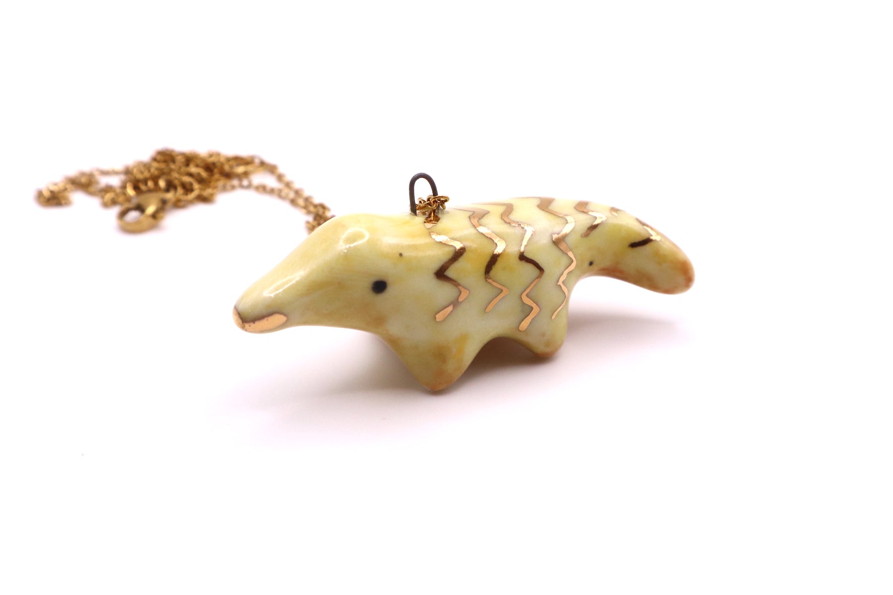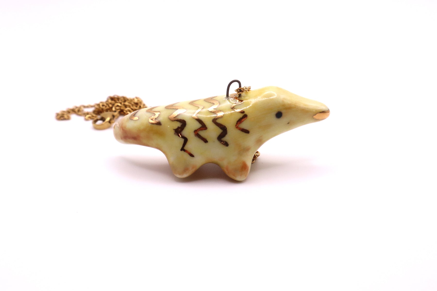 This long necklace features lovingly handmade porcelain animal. It has been hand sculpted and finished with a beautiful non-toxic glaze and gold luster. The luster contains real gold with a brilliance of 22K.