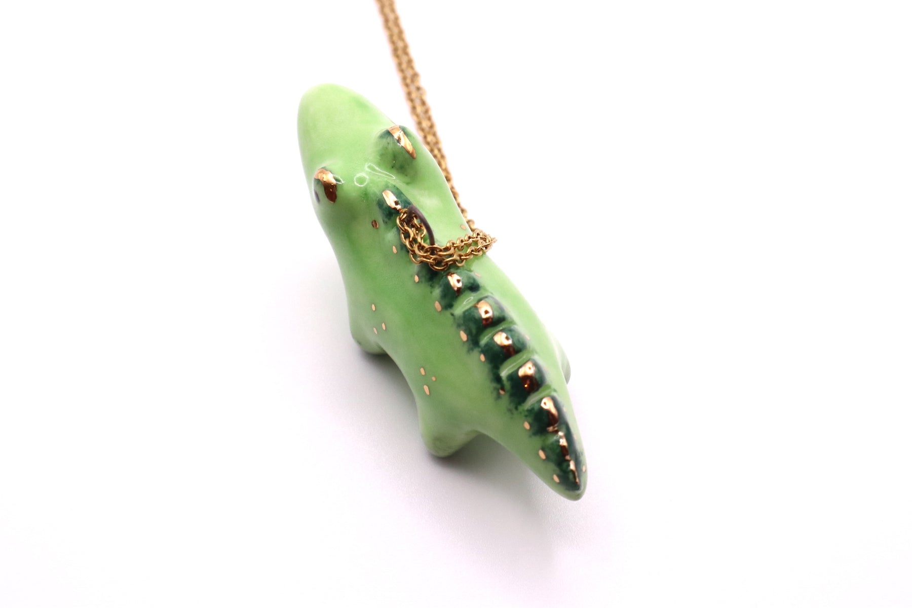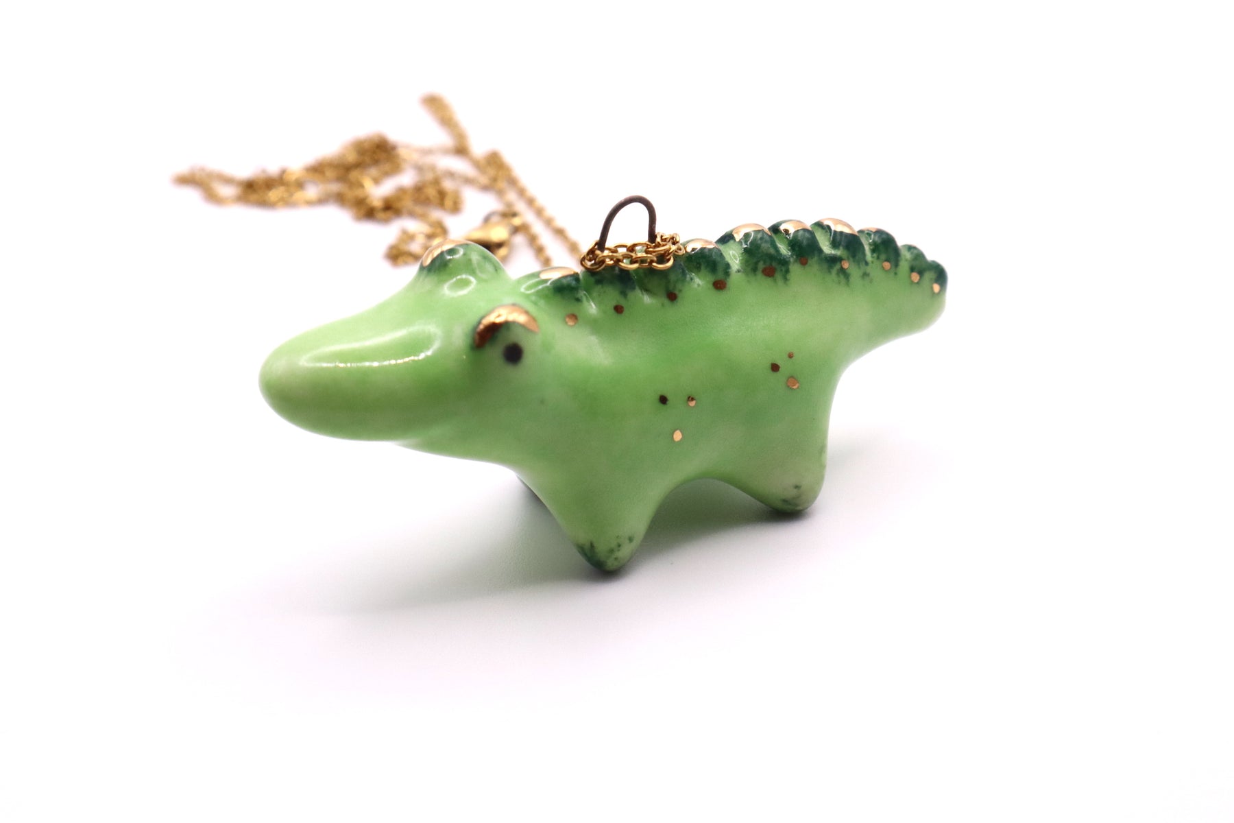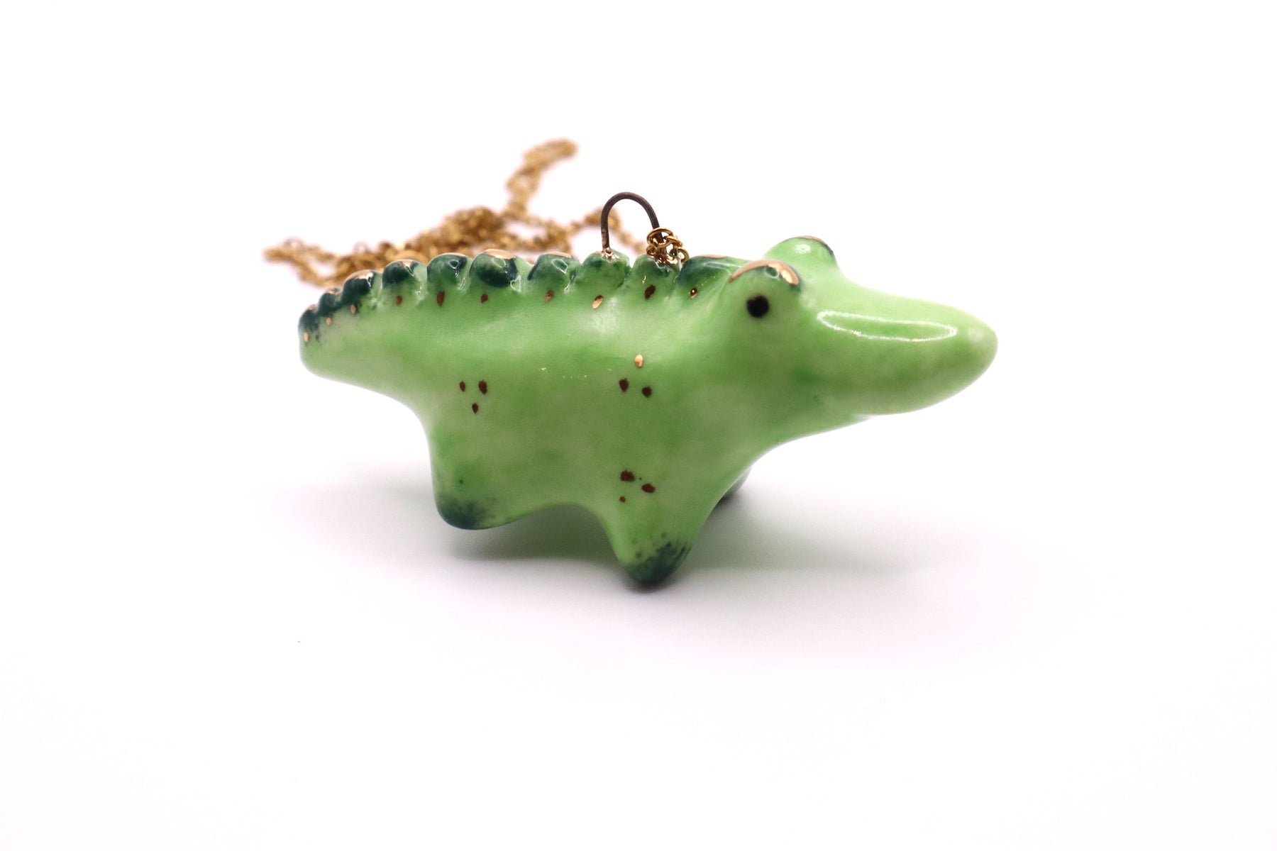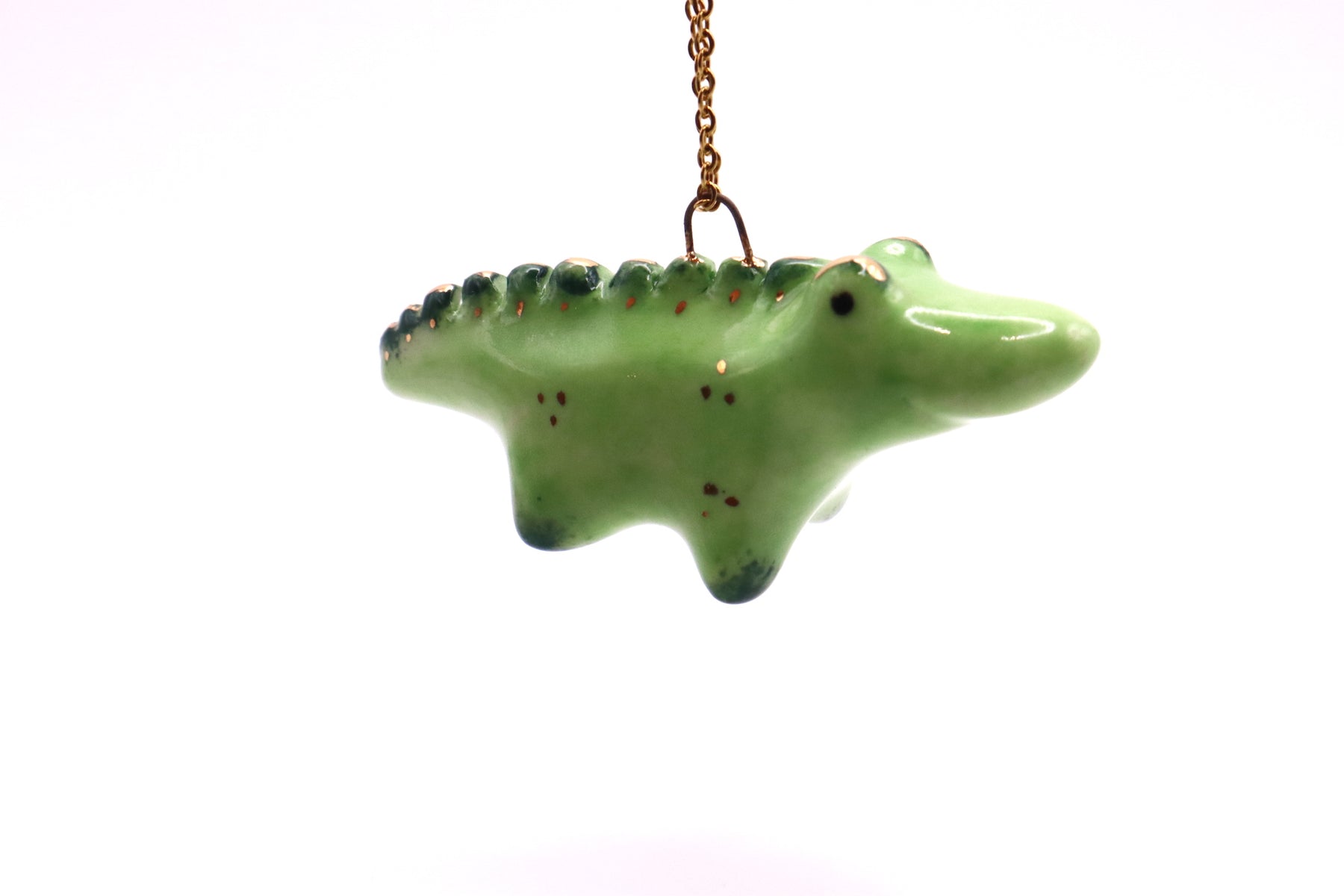This long necklace features lovingly handmade porcelain animal. It has been hand sculpted and finished with a beautiful non-toxic glaze and gold luster. The luster contains real gold with a brilliance of 22K.
