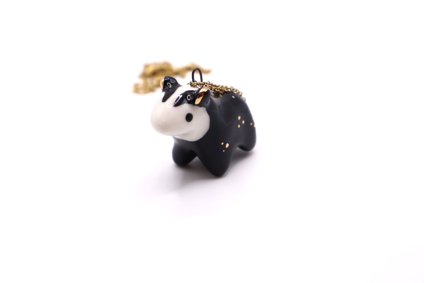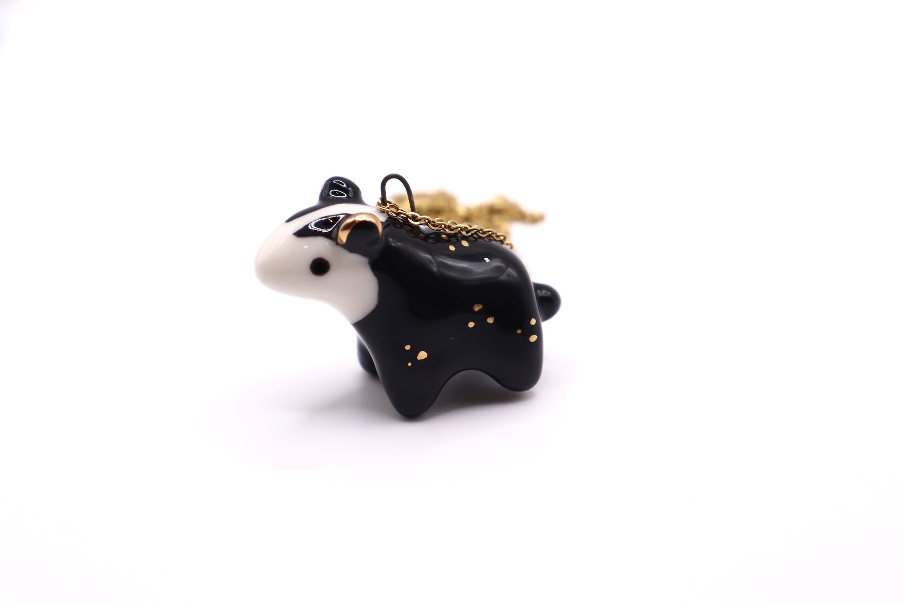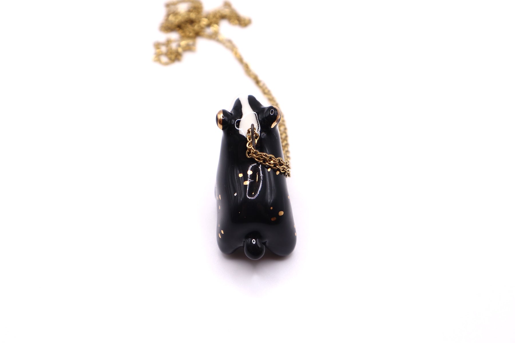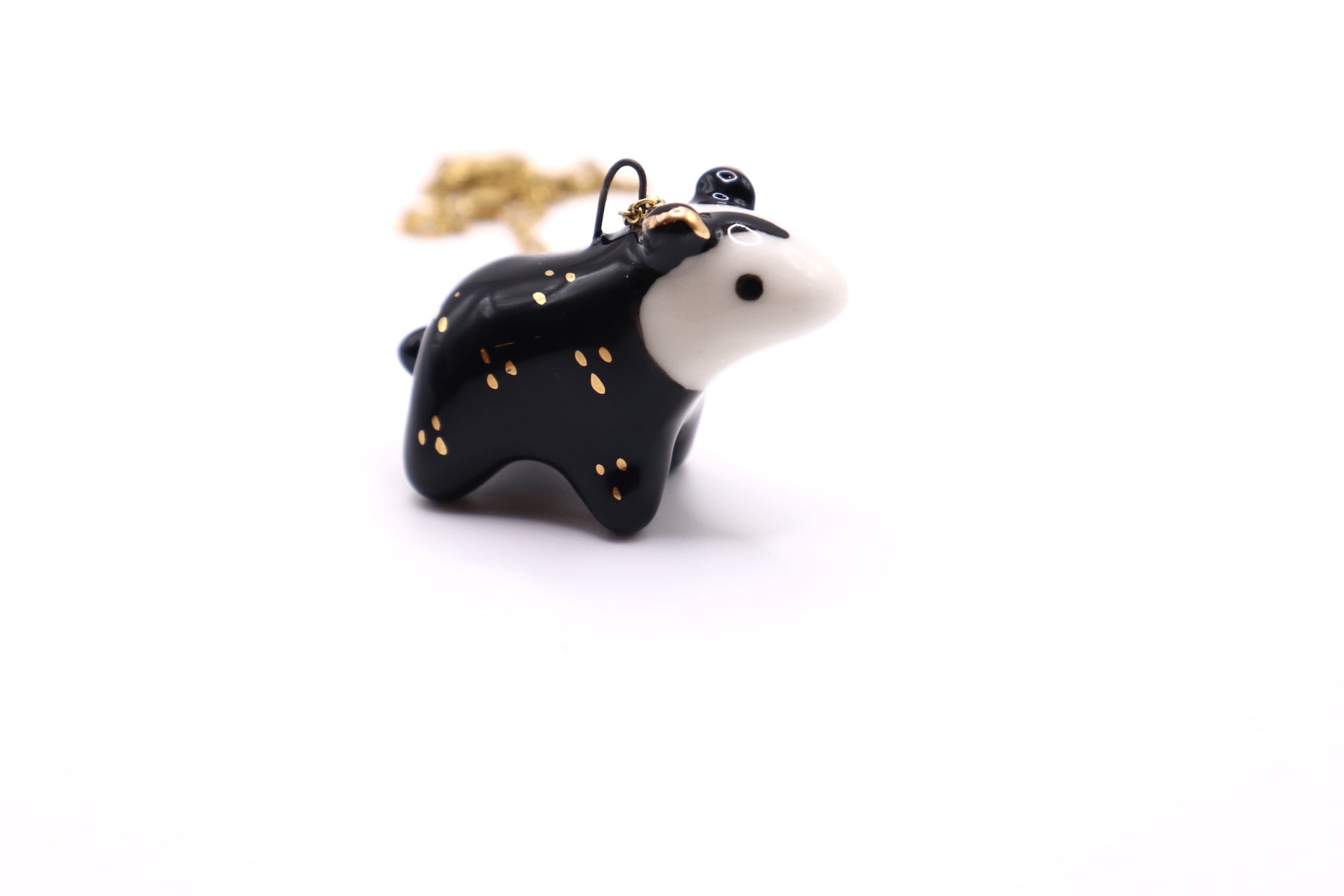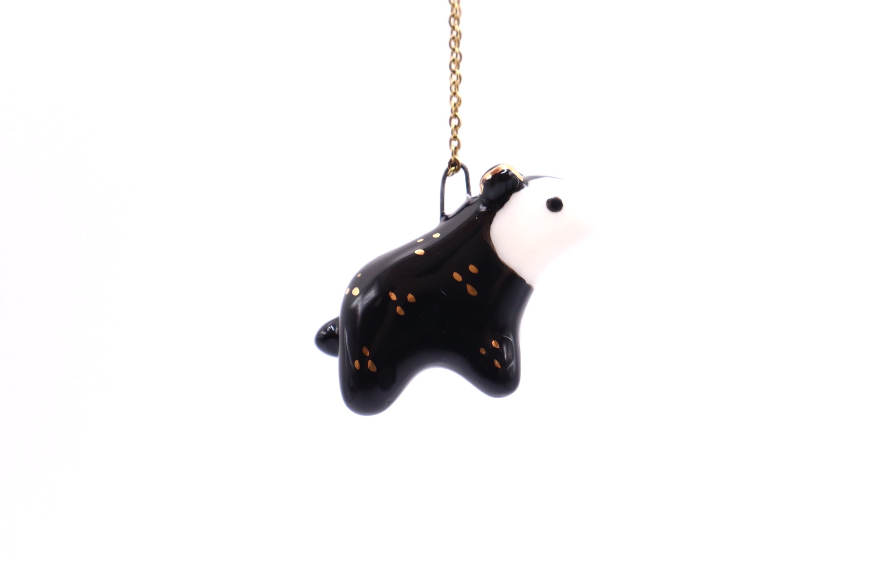 This long necklace features lovingly handmade porcelain animal. It has been hand sculpted and finished with a beautiful non-toxic glaze and gold luster. The luster contains real gold with a brilliance of 22K.