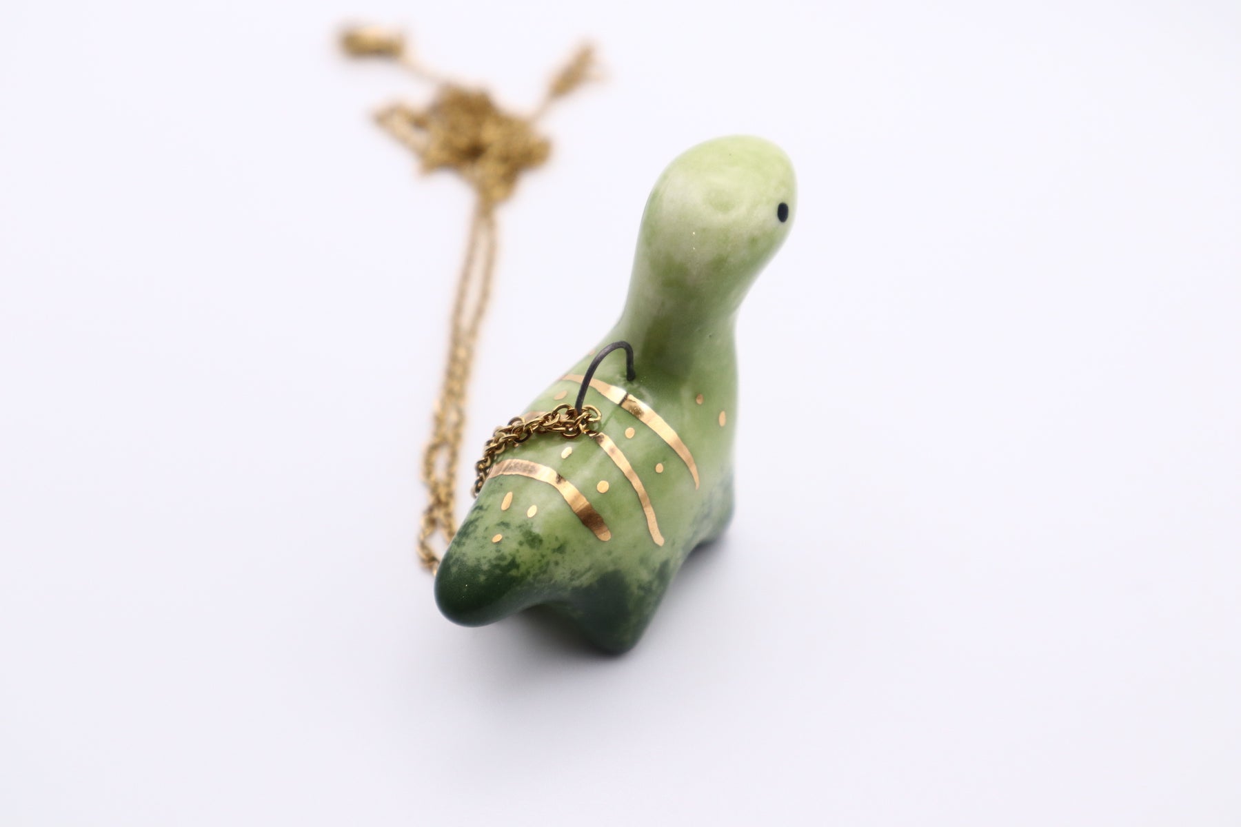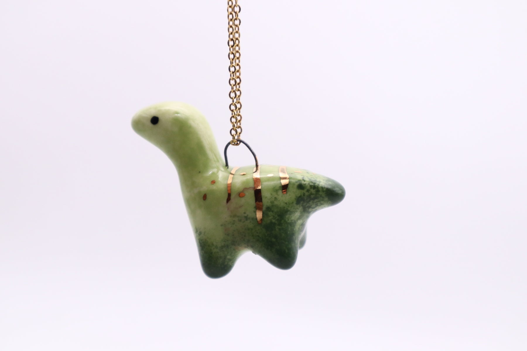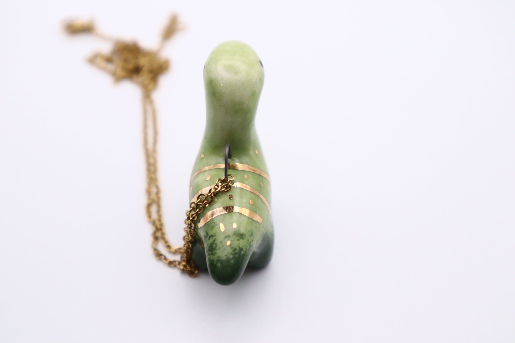 This long necklace features lovingly handmade porcelain animal. It has been hand sculpted and finished with a beautiful non-toxic glaze and gold luster. The luster contains real gold with a brilliance of 22K.