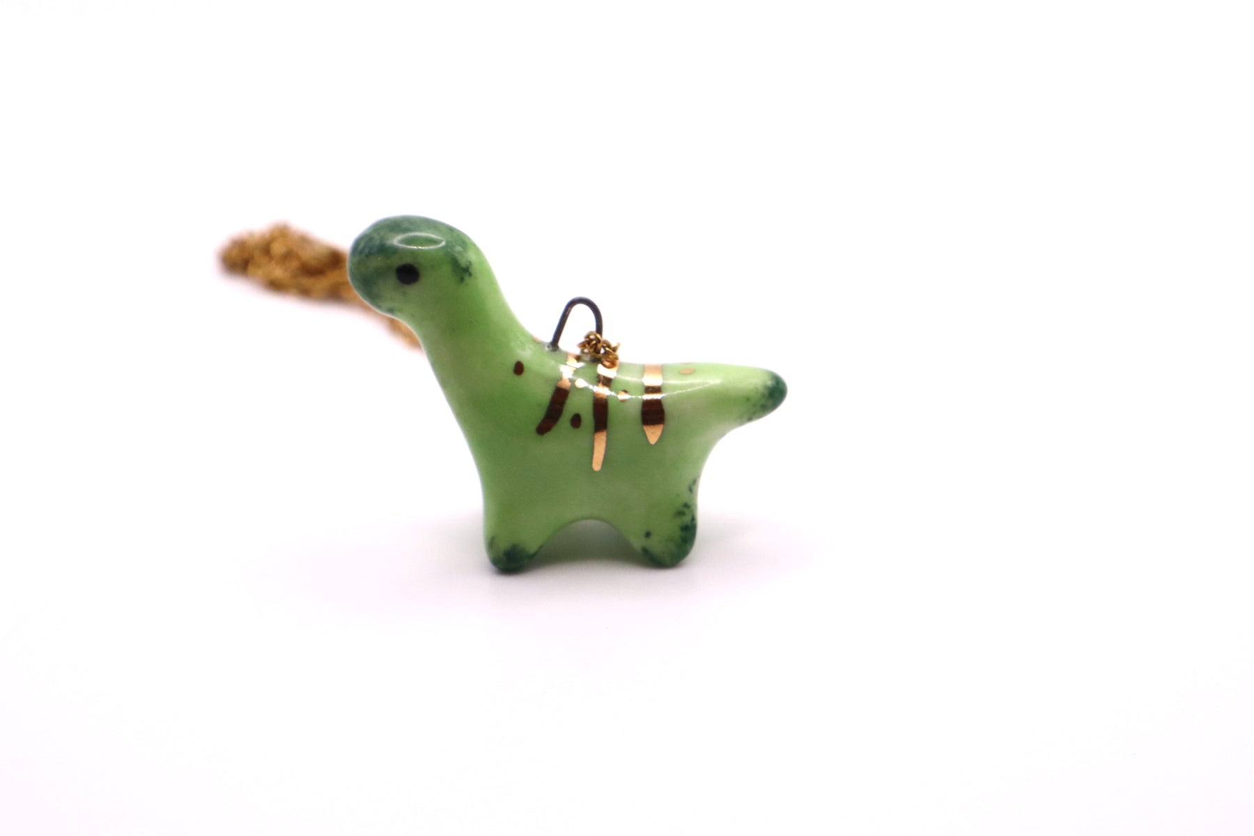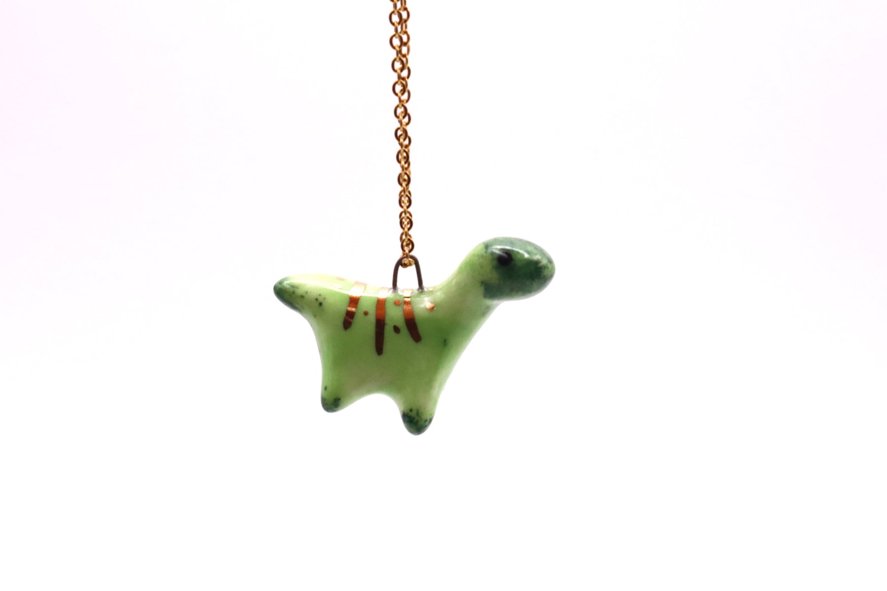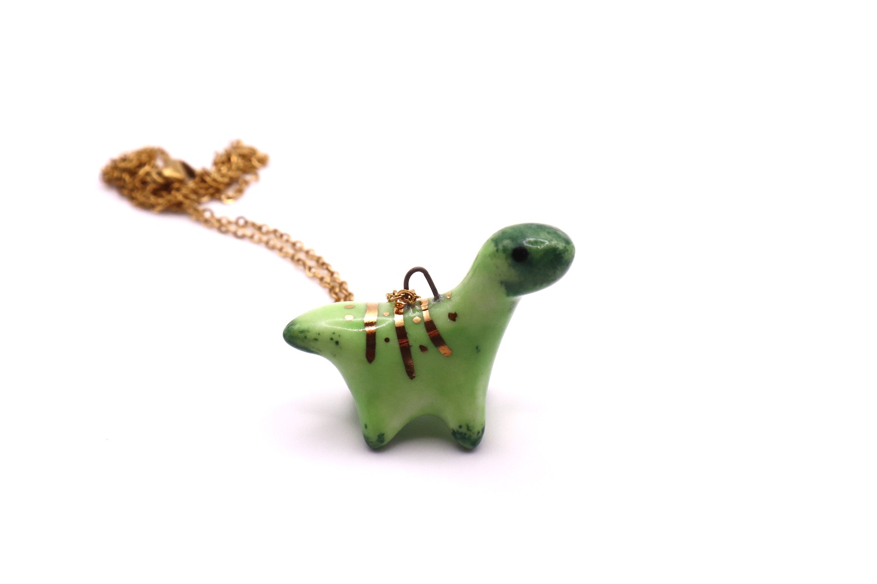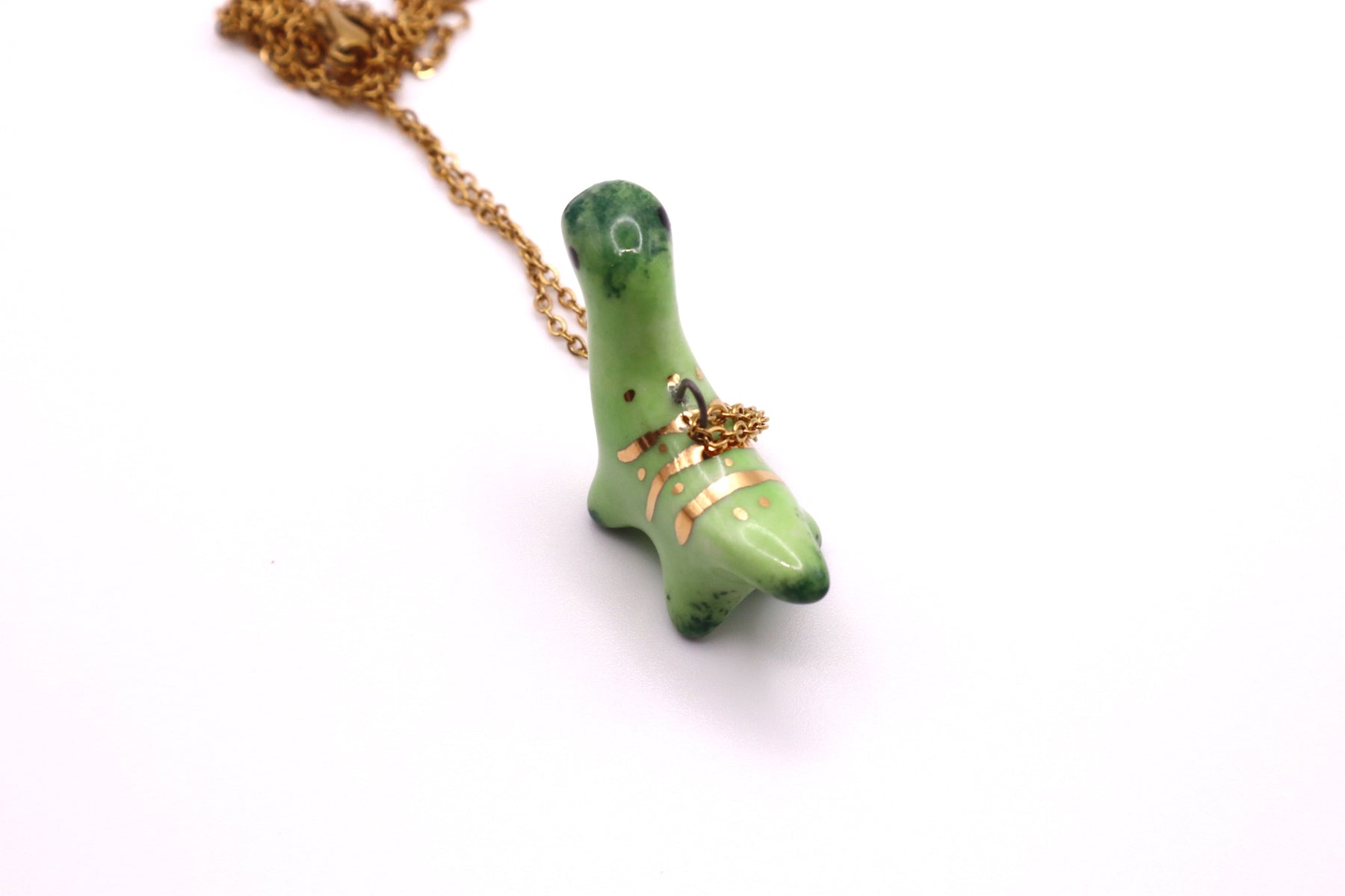 This long necklace features lovingly handmade porcelain animal. It has been hand sculpted and finished with a beautiful non-toxic glaze and gold luster. The luster contains real gold with a brilliance of 22K.